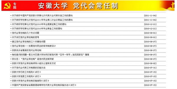 精心组织年会,让党代表充分参与学校党内重大决策。党代会2011年年会第一次会议,选举产生了我校出席省第九次党代表大会代表。2011年年会第二次会议,听取和审议了《党委工作报告》、《学校内部管理体制改革进展情况的报告》、《纪委工作报告》;审议了《安徽大学“十二五”人才队伍建设规划》、《安徽大学2011年度党费收缴、使用与管理情况的报告》、《安徽大学第七次党代会2010年年会提案工作报告》、《安徽大学校内绩效工资分配试行办法》。11月24日,大会安排了分组讨论。25日下午,学校召开党委全委扩大会议听取各代表团讨论情况的汇报。年会上,党代表对党委和纪委及其成员的年度工作还进行了评议。