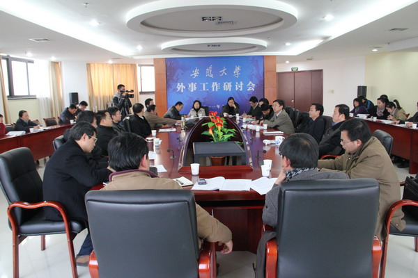 文学院、计算机科学与技术学院、外语学院、徽学研究中心等单位负责人交流了各单位外事工作开展有关情况。会议学习了《安徽大学“十二五”教育国际化规划》,研讨了《安徽大学教职工出国(境)管理办法》(修订稿)、《安徽大学外籍教师(专家)聘请和管理若干规定》(修订稿)、《安徽大学学生出国(境)学习管理规定》。