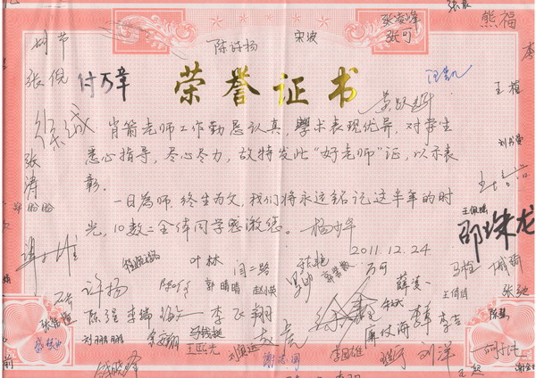 数学科学学院2010级二班学生颁发给肖箭老师的“荣誉证书”