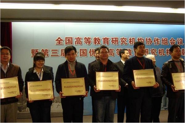 本网讯(夏焰)从全国高等教育研究机构协作组会议暨第三届全国优秀高等教育研究机构表彰大会上获悉,我校高等教育研究所被评为“第三届全国优秀高等教育研究机构”,这是我校高教所自2005年成立来首次获此殊荣。我校高等教育研究所参会代表(左一)在大会上领奖 本次会议由中国高等教育学会高等教育研究机构协作组主办、广州大学承办,于12月24日至25日在广州大学桂花岗校区举行。来自全国100多所高校的近200名代表参加了会议。