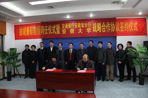 本网讯(新闻中心 德颉)1月9日上午,我校与交通银行安徽省分行战略合作签约仪式在磬苑校区办公楼B202会议室举行。校长程桦、交通银行安徽省分行行长徐斌出席签字仪式并讲话。副校长王群京、交通银行安徽省分行副行长张莉代表双方签署战略合作协议。