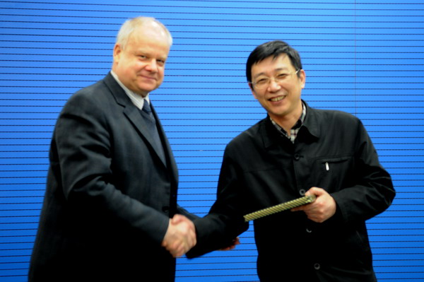 校长程桦(右)与Thomas Awe交换纪念品