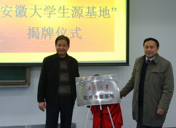 本网讯(毕涛)2月28日下午,我校与合肥市第八中学共建生源基地揭牌仪式在合肥八中举行。副校长杜先能出席揭牌仪式并为生源基地揭牌。副校长杜先能(右)为我校合肥八中生源基地揭牌 我校教务处、学生处有关负责同志,合肥八中师生代表等参加了揭牌仪式。合肥八中为我省首批省级示范高中,多年来为我校输送了很多优质生源,仅2011年录取在我校一本的合肥八中考生就有80余人。
