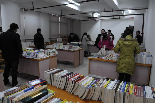 本网讯(孙龙飞 王炎)2月29日,磬苑校区文典阁一楼东大厅,八九张桌子上摆满了各种新书。新闻传播学院2011级的潘奇同学拿起了一本朱光潜的美学作品书,看了看之后放进了篮筐。他为学校图书馆选了一本书。