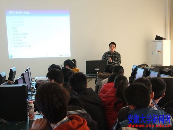 本网讯(资源与环境工程学院 张浩)3月18日,资源与环境工程学院邀请超图公司工程师吕文静给报名参加省第三届大学生GIS技能大赛的2011级地理信息系统专业本科生进行GIS技能培训和指导。通过一整天的培训,同学们学会了SuperMap Deskpro 6.0的安装和操作,懂得了配准、矢量化、数据的编辑和检查等地图处理方法。
