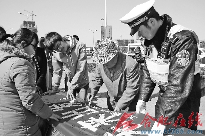 9:40许,骑行队伍来到明珠广场,学生们在路边摆起桌子,摊开宣传横幅,向路人宣传“绿色出行”。很多市民见状,纷纷在横幅上签名,表示支持“绿色出行”。本报记者 王凯 摄 作者:王凯