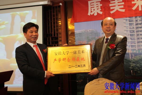 王群京(右)与余春赋共同为安徽大学-康美来产学研合作基地揭牌