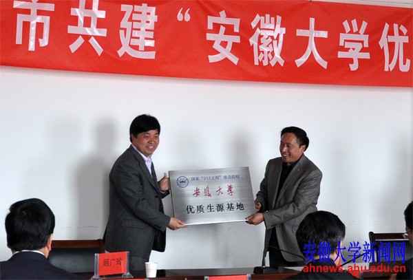 王共伟主持授牌仪式,郜汝民致辞,杜先能和李华民分别发表了热情洋溢的讲话。杜先能详细地介绍了安徽大学的基本情况以及教学、科研实力,他代表学校欢迎宿州市的优秀学子报考安徽大学。李华民说,建立生源基地,意味着高中教育和高校教育将进一步走向融合,对宿州市教育的改革必将起到良性互动的促进作用。