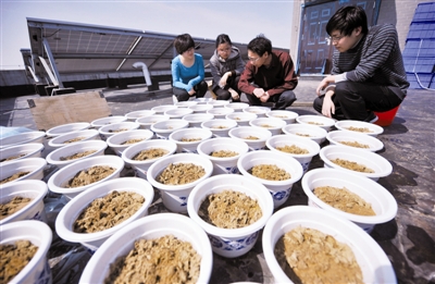安大新区理工楼顶层,孙庆业蹲在花盆前端详他的“宝贝”。“最下面是从重金属废弃地取来的矿粉,上面是定植块。把秸秆粉碎,加上天然粘合剂和极少的土壤,用机器压成块,定植块就形成了。”孙庆业说,草种也同时被放了进去,平时只要洒洒水就能长出草。