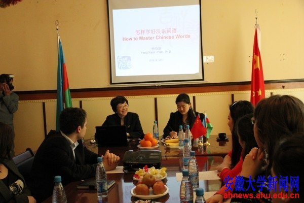 4月24日,国际教育学院副院长杨晓黎教授在巴库大学孔子学院为孔子学院学员、汉语专业学生及汉语学习爱好者带来了一场题为《怎样学好汉语词语》的精彩讲座。她用通俗生动的语言、翔实鲜活的例句,使汉语学习者对汉语词语的学习有了更加深刻的理解,带领大家享受了一场汉语词语的盛宴。