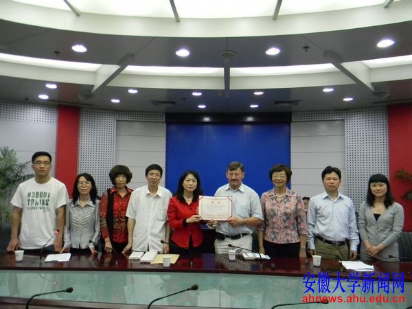 本网讯(文学院)5月14日下午,文学院在龙河校区逸夫图书馆举行仪式,聘任德国美因兹大学教授柯彼德为兼职教授。文学院党委书记徐素萍(左五)、文学院副院长徐在国(左四)等为柯彼德教授颁发聘书 聘任仪式后,柯彼德以《汉语教学的国际化与中国文化走出去策略》为题介绍了德国汉语教学情况。柯彼德,美因兹大学中国语言文化系教授、主任,2000年9月获得“中国语言文化友谊奖”。发表汉语语言学与教学、中国政策与文化、跨文化等方面的学术论文80多篇,主编出版汉语教材、中国文化研究多部著作。