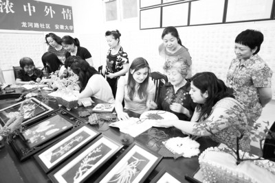 2012年5月18日 安徽日报 5月17日,合肥市三里庵街道龙河路社区的编织能手,正在教几名留学生编织中国结。该社区与安徽大学共同成立了“跃龙门”文化驿站,定期开展丰富多彩的社区文化活动。(李合萍 摄)