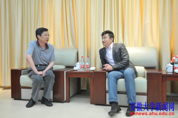 演讲开始前,校长程桦在磬苑体育馆贵宾室会见了芮成钢,对他访问我校表示欢迎并合影留念。