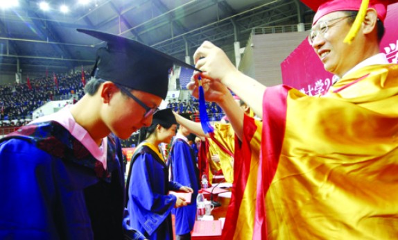 又到一年毕业时。昨天上午,安徽大学磐苑校区体育馆座无虚席,6000多名毕业生身着学士、硕士和博士服,请老师扶正流苏——该校首批“90后”毕业生即将走出校园。