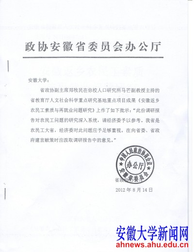 本网讯(卢兆敏)省政协发专函至学校,转发省政协副主席郑牧民对我校农村社会发展研究中心专职研究员马芒副教授的研究报告“安徽返乡农民工素质与再就业问题研究”的重要批示。批示全文为“此份调研报告对农民工问题的研究深入系统,请经济委予以参考。我省是农民工大省,经济委对此问题应予以足够重视,在向省委、省政府建言献策时应汲取调研报告中的意见。”