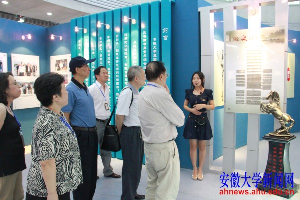 在校史馆,部分77、78级校友认真聆听着讲解。领导的亲切关怀、学校的辉煌历史、历任学校领导和历届师生的辛勤奉献,深深地打动着这些改革开放伟大实践的亲历者。在多媒体放映厅,大屏幕上播放着学校自创建以来的重大事件,一些珍贵的音频和影视资料让不同时期的历史浮现在校友眼前。墙壁上展示的安大校友风采,玻璃展柜中陈列的老课本、奖状、证书都吸引着校友留恋忘返。校友们为学校的建设成就、师资力量和办学条件都对母校近年来的快速发展所赞叹,为学校优美的校园环境、优良的办学条件、浓厚的历史文化积淀感到自豪和欣慰。外语系77级校友刘先生在参观完校史之后表示,为母校的快速发展而高兴,祝福母校明天更加辉煌。