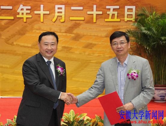 校长程桦(右)与马鞍山市副市长季翔互换协议文本
