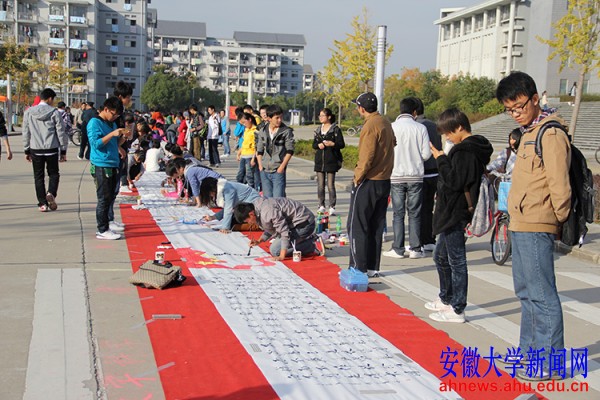 各个院系的同学在长达百米的画卷上留下了属于自己院系的独特书法和绘画作品,行书、草书纷纷入卷,梅花、荷花竞相开放。一位撰写隶书的同学说道:“虽然这样的字体写起来很复杂,但是这表达了我们的一片心意。”同学们用各种书画方式来表达普通在校大学生对党的十八大召开的美好期待和对祖国未来发展的关注。