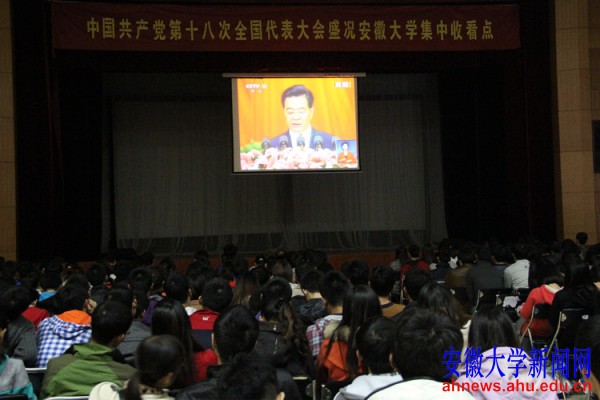 本网讯(宗禾,学生记者曹俊松 接丹丹 孙龙飞 杨旭舟)11月8日上午,安徽大学师生沉浸在一片喜悦中,他们通过各种方式收听收看十八大开幕实况直播,感受来自祖国心脏的最强音,用喜悦的心情表达着对党的美好祝愿、对幸福生活的美好期待。