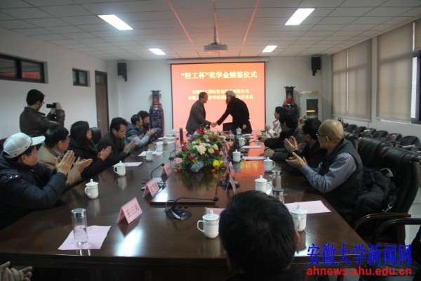 本网讯(学生记者 周阳)记者从12月19日下午举行的“轻工杯”奖学金续签仪式上获悉,“轻工杯”奖学金再续签5年,奖励金额比之前翻了一番。“轻工杯”奖学金由安徽轻工国际贸易股份有限公司在我校经济学院设立,是我校设立最早的奖学金之一,20年来已有约500人获得奖励,成为校企合作培养人才的成功典范。