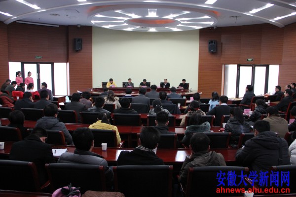 本网讯(新闻中心 李贤,学生记者 曹俊松)1月18日下午,安徽大学召开第十一次党建与思想政治工作研讨会,表彰第十一次党建与思想政治工作研讨会获奖论文和优秀组织奖单位,以及2012年度贯彻执行《安徽大学新闻宣传工作积分制度》先进单位、先进个人;对党建与思想政治工作、优秀论文评选、新闻宣传工作积分制度贯彻执行情况等议题进行交流研讨。