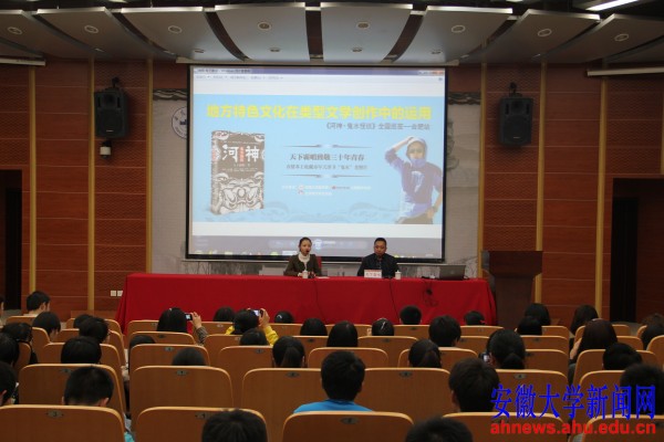 张牧野首先介绍了自己的家世背景、个人经历以及写作历程,并和同学们分享了自己的写作心得:“写作嘛,得符合逻辑,有理有据,层层深入才能引人入胜。”谈到写《鬼吹灯》的初衷,他说:“这本书是盗墓文学,很大程度上是为了满足部分人一夜暴富的心理。”诙谐幽默的话语令在场同学开怀大笑。大家感受到了这个中国想象力最丰富的作家那奇幻的心理世界和写作灵感以及多彩的人生阅历。吴明昊同学道出了自己对此次文学报告会的看法:“老师的话语很实在,也很轻松。对待这样的文学作品应该带着一颗体验生活的平常心才能收获更多心得。”文学社社长陶雨程同学表示:“张老师的作品在安大学子中享有较高的知名度,相信此次活动一定会取得圆满的成功。”