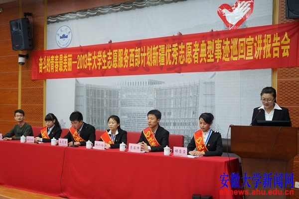 本网讯(新闻中心通讯员 赵欢欢)4月1日下午,“奋斗的青春最美丽”2013年大学生志愿服务西部计划新疆优秀志愿者典型事迹巡回宣讲报告会,在磬苑校区文典阁报告厅举行。