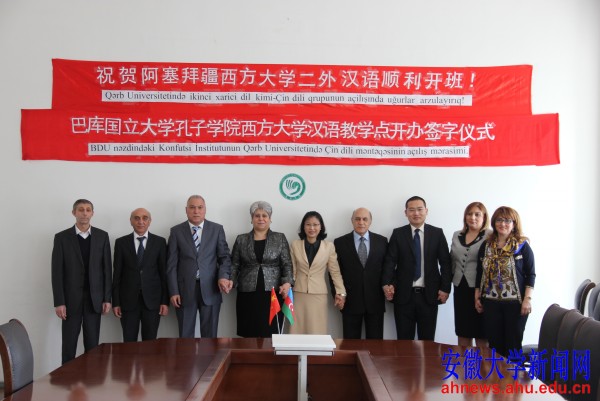 本网讯(胡凤华)日前,在阿塞拜疆西方大学大礼堂,巴库国立大学孔子学院与西方大学签署《关于汉语教学与中国文化推广合作协议》,同日西方大学汉语教学点开班。该教学点是该孔子学院设立的第三个汉语教学点。