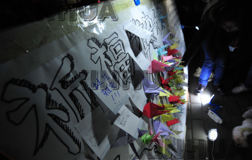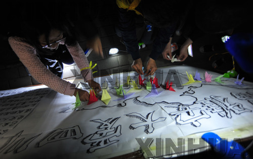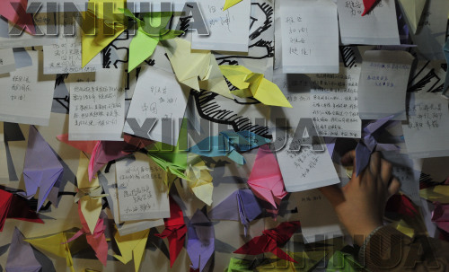 4月21日晚,大学生们在祈福墙上粘贴纸鹤和祝福语。当晚,安徽大学磬苑校区200余名大学生自发举行“雅安祈福”活动。大学生们用点燃的蜡烛摆出“4.20雅安”等字样,在祈福墙上张贴纸鹤和祝福语,为四川雅安地震灾区同胞祈福、加油。