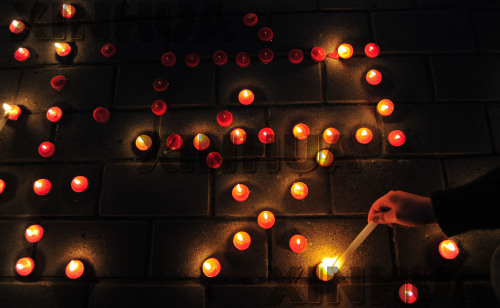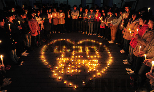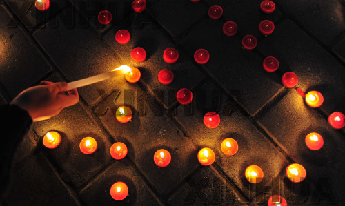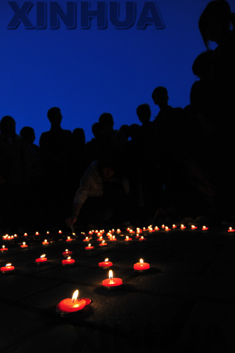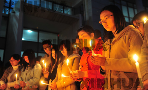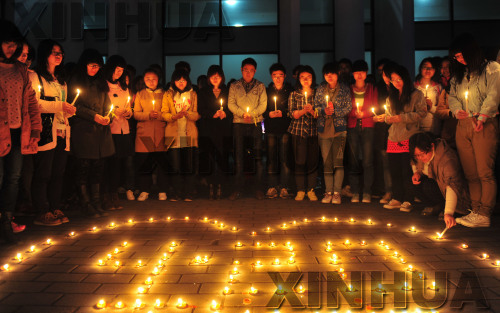 4月21日晚,大学生们点燃蜡烛为雅安地震灾区同胞祈福。
