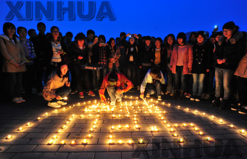 4月21日晚,大学生点燃蜡烛为雅安地震灾区同胞祈福。