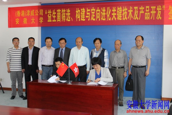 本网讯(新闻中心通讯员 黄敏)5月11日上午,安徽大学生命科学学院与香港津威公司“益生菌筛选、构建与定向进化关键技术及产品开发”签约仪式在磬苑校区办公楼B202举行。副校长王群京出席签约仪式。签约仪式现场 生命科学学院教授童望宇与公司代表龚慧芬签署协议。双方将在益生菌筛选、构建与定向进化关键技术及产品开发等方面展开合作。科学技术处、生命科学学院负责人参加仪式。