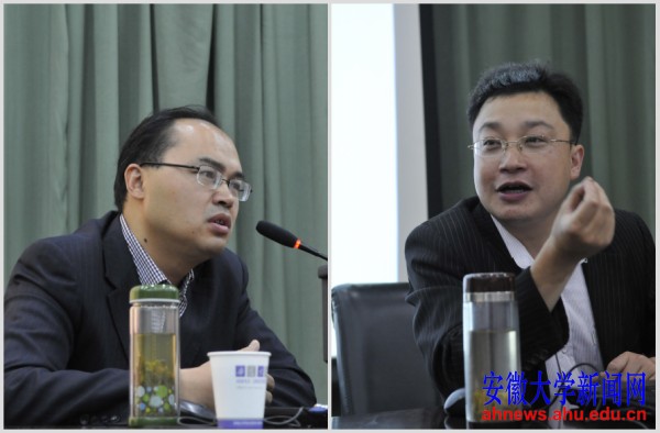 安徽大学十八大精神宣讲团成员潘金刚(左)、李明(右)在作报告
