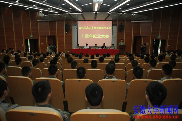 程桦在纪念大会上发表了讲话。他说,学校自2003年签约成为南京军区国防生培养院校以来,坚持将普通高等教育规律和军事人才培养规律相结合,充分发挥学校办学特色,不断加强与部队沟通协作,确保依托培养工作健康有序发展。十年来,共培养毕业国防生366名,他们在部队各条战线展现了安大学子的风采,得到了部队首长的高度评价。目前,我校还有170名国防生在校接受培养。