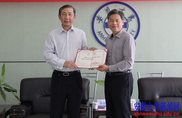 本网讯(新闻中心学生记者 殷一冉 孙天宇)6月15日下午,兴业银行合肥分行行长荣益民客座教授聘任仪式在安徽大学龙河校区逸夫图书馆举行。校党委书记黄德宽为荣益民颁发聘书。仪式由商学院院长李晓玲主持。