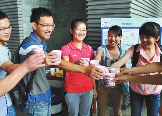 学生们端起自酿的啤酒干杯。