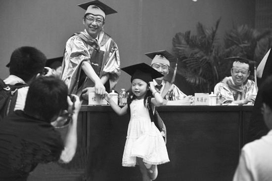 昨日上午9点,安徽大学2013届学生毕业典礼暨学位授予仪式在磬苑体育馆举行。仪式即将结束时,一名4岁小女孩头戴学士帽突然跑上台,全场发出惊叹声。程桦校长俯下身,轻轻地扶正小女孩学士帽上的流苏,还亲切地和她握手合影,同学们对这个温馨可爱的小插曲报以热烈掌声。小女孩的母亲告诉记者,孩子的父亲今天参加MBA学位授予仪式,“我们今天都特别兴奋,小孩是被他爸爸班上的学生鼓励上台的。”