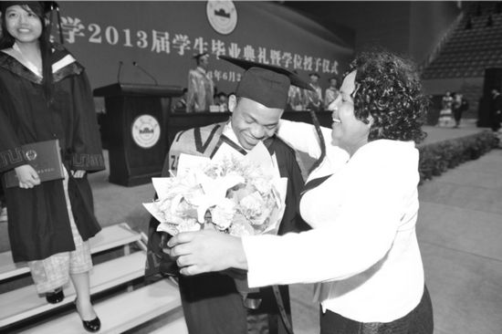 经济学院留学生“阿里”的母亲也从赞比亚远道而来观礼。“阿里”被授予学位证后,母亲送上鲜花和拥抱。据了解,她为了参加儿子的毕业典礼,坐了18个小时的飞机才赶到合肥。(记者宛婧 陈群 摄影报道)