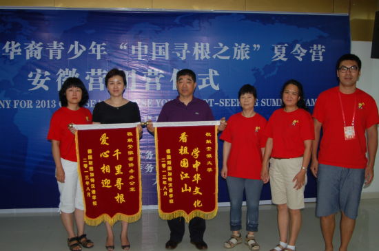 安徽大学为每一位营员和带队老师准备了一个具有中国特色的纪念品,一件青花瓷的书签。随后夏令营领队老师表示了对安徽侨办、安徽大学的感谢,并献上了锦旗。营员们为了表示感谢之情,则献上了自己精心准备的节目,有中国歌曲《童话》、《大中国》,诗歌朗诵《面朝大海,春暖花开》等。最后,安徽侨办沈蓓玉主任宣布“2013年海外华裔青少年‘中国寻根之旅’夏令营安徽营正式闭营”。(陆一)