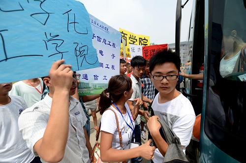 8月27日,一名新生(右一)乘坐大巴抵达安徽大学。当日是安徽大学2013级本科新生报到的日子,今年安徽大学共录取5097名本科新生。新华社记者 张端 摄