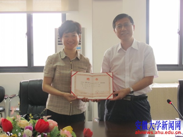 本网讯(经济学院)9月13日下午,安徽大学经济学院79级校友、国家行政学院博士生导师董小君教授受聘安徽大学兼职教授仪式,在社科楼D403经济学院会议室举行。校党委副书记李仁群向董小君教授颁发了聘书。