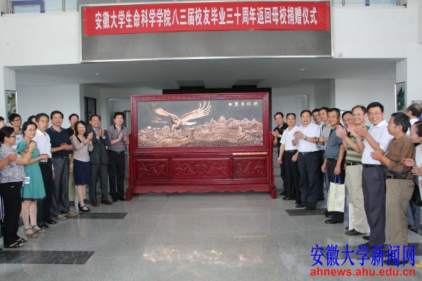 生命科学学院83届校友向安徽大学和生命科学学院捐款。校友还捐赠了屏风。屏风正面雕刻着鹏程万里四个大字以及雄鹰振翅翱翔于万里长城之上的图案,寓意校友对生科院蓬勃发展再创辉煌的期望;背面雕刻着迎客松,并刻诗一首:“奇松傲立玉屏前,阅书沧桑色更鲜。双臂垂迎天下客,包容四海寿千年。”寓意着安徽大学热情好客,对老校友的感情浓重而长久。