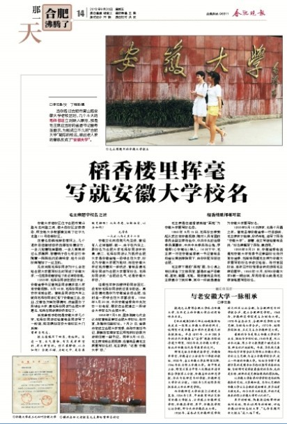 离开的时候,陈教授还略带神秘地对我说,国庆60周年的时候,评选安徽60件标志性大事,“毛泽东题写安大校名”还入选了呢。(李云胜)