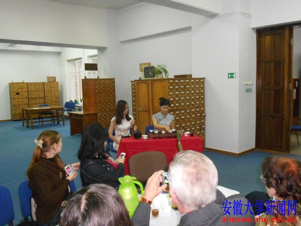 又讯(王静 张纪红 朱玺 赵韵韵)在乌克兰“图书馆日”到来之际,安徽大学哈尔科夫国立大学孔子学院志愿者,参加了由哈尔科夫国立大学图书馆、历史系和哲学系师生举办的“书籍、哲学与文化”读书交流会,并在活动开场送上了一场清新典雅的“大益八式”茶艺表演。