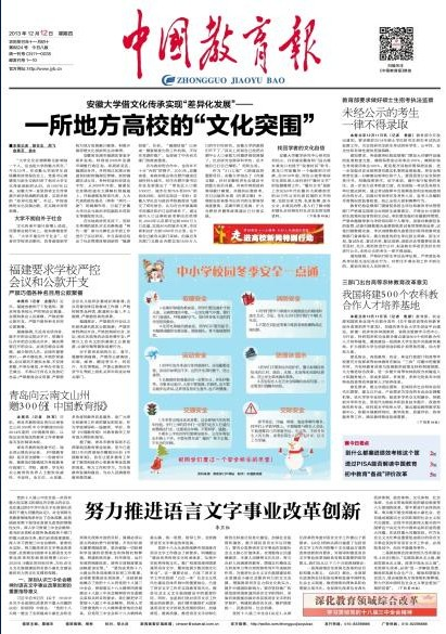 本网讯(新闻中心 李贤)今天,《中国教育报》在头版头条位置,以《安徽大学借文化传承实现“差异化发展”—— 一所地方高校的“文化突围”》为题,重点报道了我校坚持将文化传承提升到学校战略的高度,实现学校的“差异化发展”的经验和做法,全文如下: