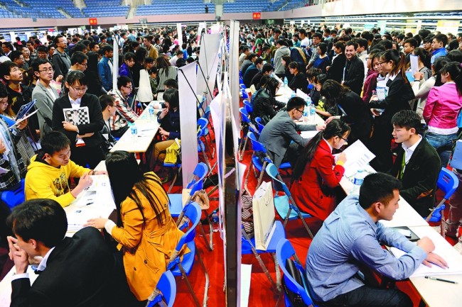 2014年4月3日 安徽日报 4月2日,大学生在安徽大学应届毕业生双选会上求职。 当日,安徽大学2014届毕业生(春季)双选会在该校磬苑校区体育馆举行,来自全国的143家用人单位进场招聘,提供5000个就业岗位。新华社发