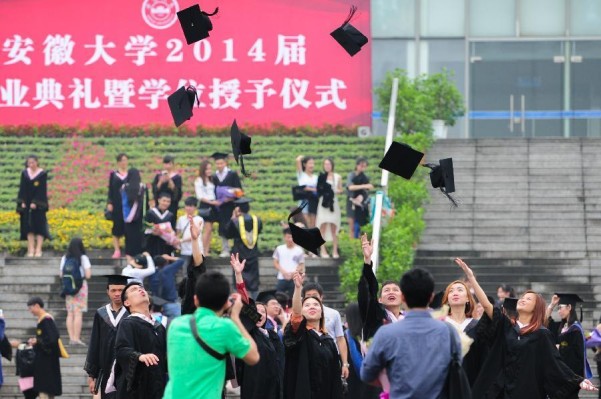 2014年6月30日 新华社 6月29日,安徽大学2014届毕业生向天空抛起学位帽。当日,安徽大学2014届毕业典礼暨学位授予仪式在该校体育馆举行,7700余名2014届本科、研究生毕业生参加。新华社记者 杜宇 摄