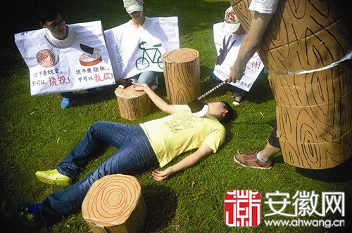 昨日,合肥杏花公园来了一群“奇怪”的年轻人。他们或变装成大树和“伐木工”进行斗争,或化身“行走”的画报在公园小径上走走停停。原来,这是安徽大学环境保护协会2013保护湿地团队在举行主题为“破坏自然会遭到自然的报复”这一系列活动。队员试图通过行为艺术来宣传环保理念,用手绘“绿地图”带领市民走进安庆湿地,向市民讲解湿地被破坏的严峻现状。