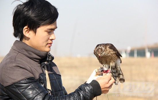 小伙叫马浩浩,高中时就对鹰猎产生浓厚兴趣,上大学后,开始养鹰训鹰,最早从朋友手中购买了人生中的第一只雌性日本松雀鹰。“刚开始的时候,由于实践经验少,驯养的鹰死的死跑的跑,都没有驯养成功。经过两次艰苦的拜师学艺,终于掌握了鹰类和隼类的驯养办法。”马浩浩说。