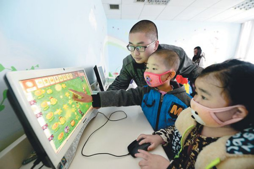 11月15日,在安医大二附院白血病患儿活动中心,参与“光头挑战”的大学生志愿者陪患儿一起游戏。李博摄